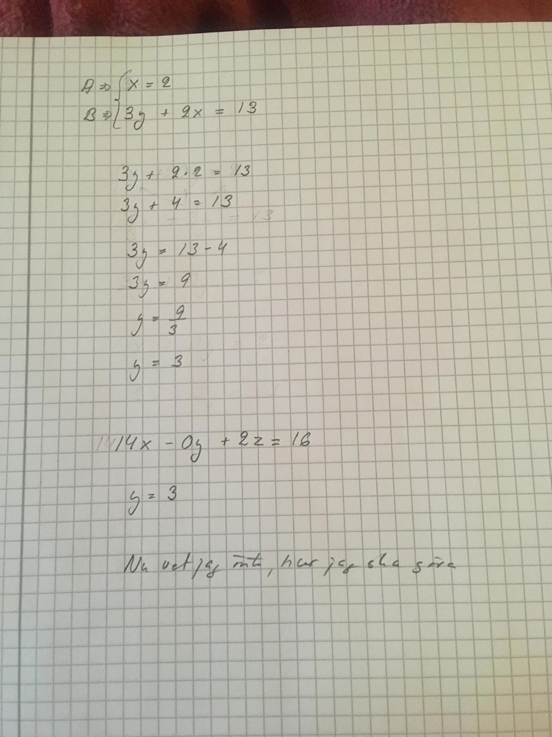 Jag har en uppgift på gång som jag håller på funderar här, hur jag ska göra, men det är liknande problem som det här. Jag har inte ännu kommit särskild långt med den. Nu tänker jag fundera bra tag med den. Använder inte samma metod mera. Försöker använda substitutions metoden. Det är inte lätt när det handlar om tre obekanta. Additions metoden fungerar inte på den här. Nu funderar jag hur jag ska lösa uppgiften.
