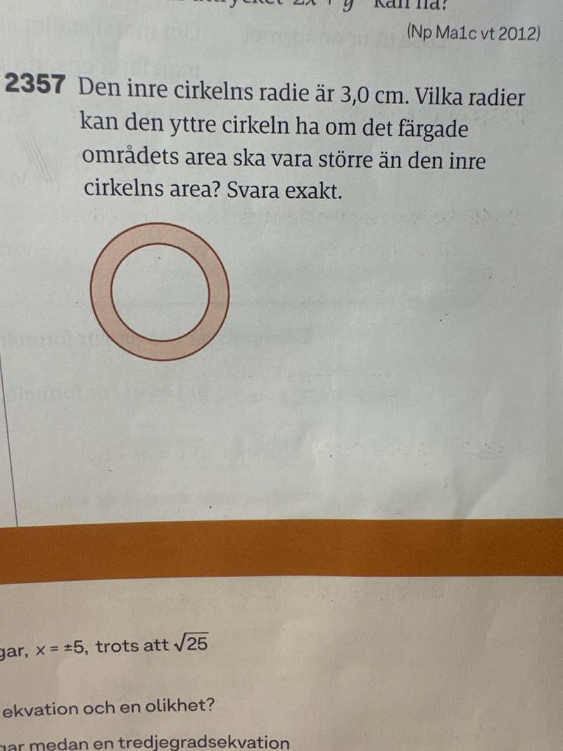 Ja, så står det, och det betyder att frågan i sig är felformulerad. Det borde i så fall stå att den inre cirkelns radie är exakt 3 cm.