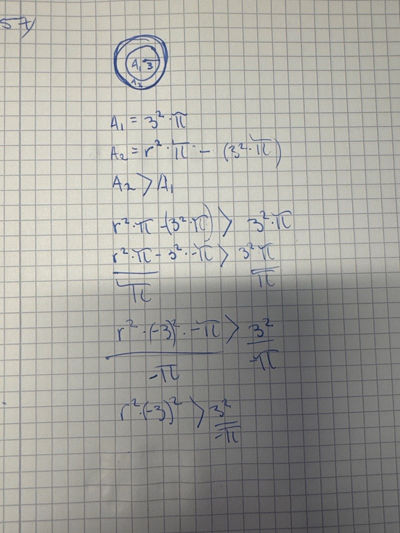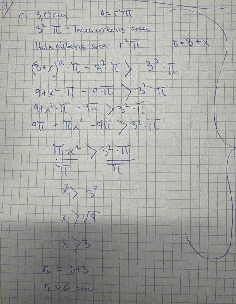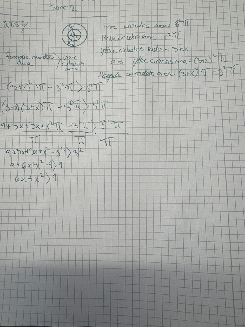 Annars skulle man kunna börja med att hela cirkeln skall vara minst dubbelt så stor som den lilla, dvs minst 18*pi. Då hamnar vi direkt I samma olikhet