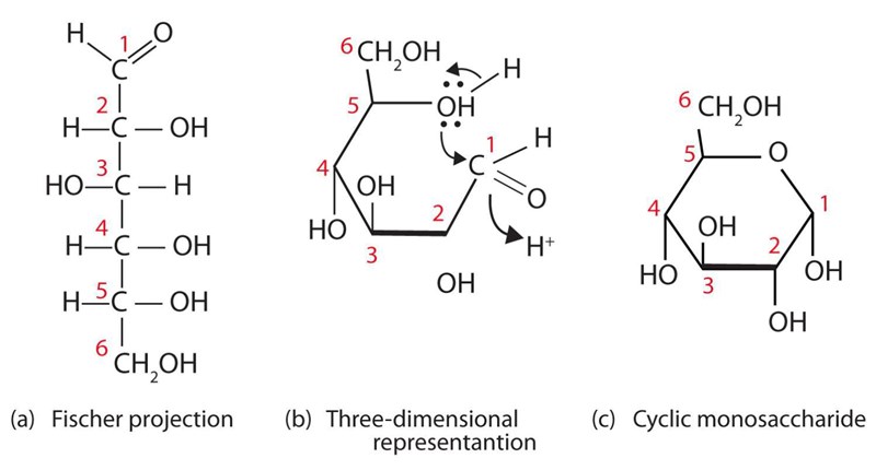 Kolhydrater med fler än fyra kolatomer förekommer framför allt i ringformen. Ringformen är stabil, då ringen är tillräckligt stor så att inte blir någon spänning i ringen - som finns mindre ringar med tre eller fyra kol (där är vinklarna mellan kolen mindre än de ideala, och förenklat kan man säga att elektronerna vill ha mer plats och därför öppnas dessa mindre ringar enklare än de sluts). I ringformen är dessutom aldehyd- eller ketogruppen omvandlade till en mindre reaktiv form.