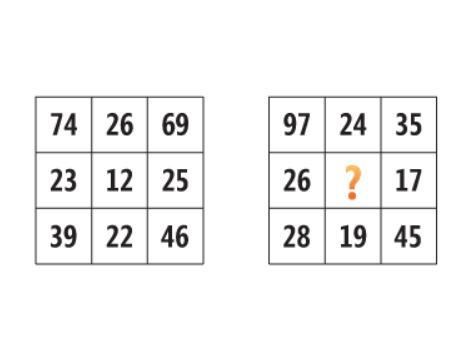 Guggle hittade en smart och bra lösning. Men det allra enklaste (tror jag) är att göra summorna av alla tal i vardera matris lika. Då blir svaret 45. Enkelt är bra och kräver inte lika hög IQ :-)