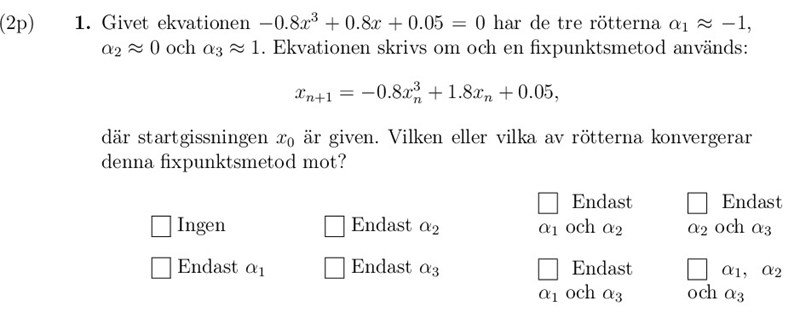 Sen ska man derivera g(x) och kolla så att absolutbeloppet av g(x0)<1 men vad är x0 i detta fall, ska jag sätta in varje rot i funktionen d.v.s. -1,0 och 1? Men det jag får är att absolutbeloppet av g(0) är det enda som är mindre än 1 och då är det de enda som konvergerar men svaret blir tydligen -1 och 1. Förstår inget..