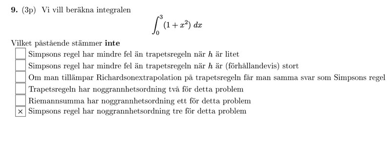 pepparkvarn skrev:Du har nog läst frågan lite knasigt. Frågan är vilket påstående som inte stämmer. Simpsons regel har generellt mindre fel än trapetsregeln, som du skriver. Tillämpning av Richardsonextrapolation på trapetsregeln ger Simpsons regel, trapetsregeln har alltid minst noggrannhetsordning två, och en Riemannsumma har alltid minst noggrannhetsordning ett. Det enda som inte stämmer är att Simpsons regel har noggrannhetsordning tre för problemet, vilket inte är sant då Simpsons regel har noggrannhetsordning fyra, minst. I vissa sammanhang kan det hända att resttermer av en metods vanliga noggrannhetsordning, n, tar ut varandra, och noggrannhetsordningen för metoden blir då (i det specifika fallet) n + 1 (eller högre).