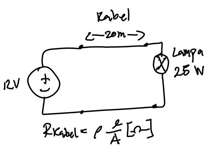Du behöver alltså räkna fram resistansen i kabeln. Tänk att den totala resistansen är: kabel + lampa, sedan när du räknar fram strömmen.