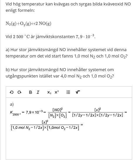 Jag försöker lösa jämviktsekvationen i fråga b, men vet ju uppenbarligen inte hur man löser ekvationer..