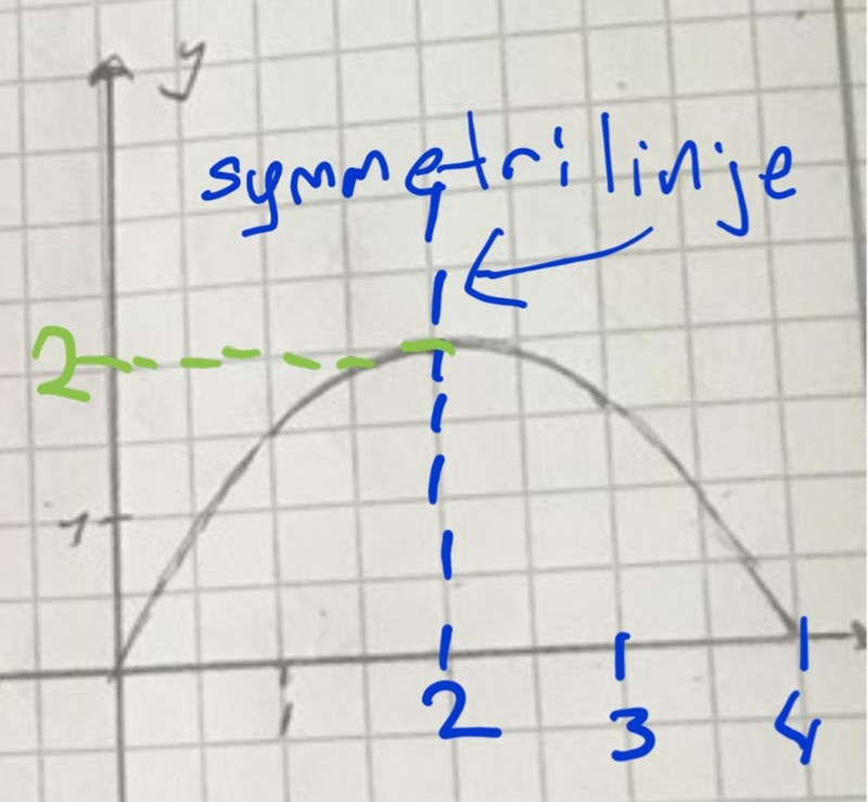 Synmetrilinjen ligger mitt emellan nollställena, dvs vid (blå). Maxpunkten ligger på symmetrilinjen och enligt bilden är funktionsvärdet i den punkten (grön).