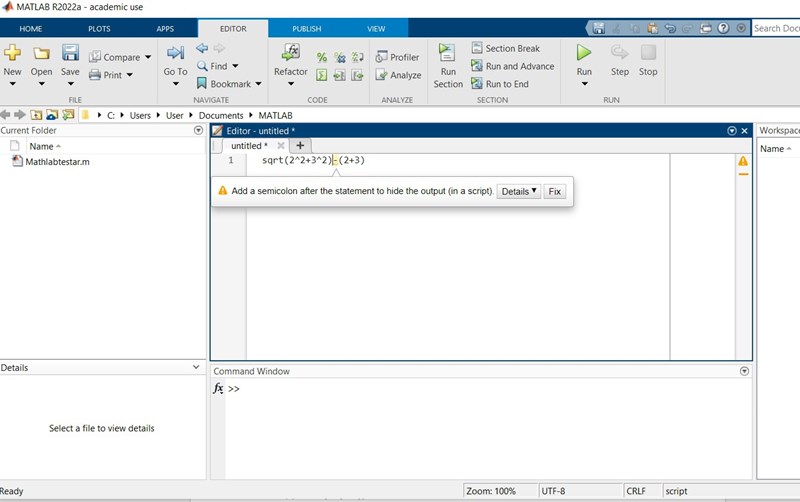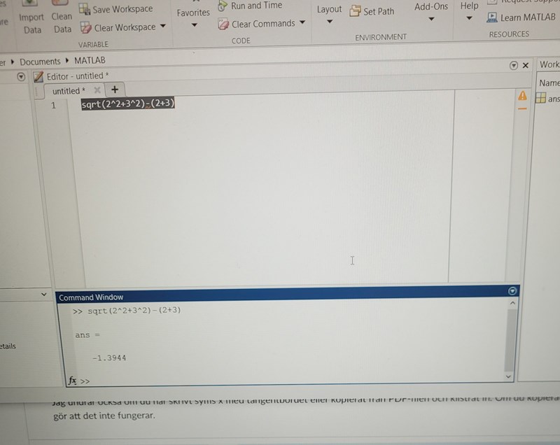 Däremot när jag skriver i Command Window så verkar jag få ett svar trots att bilden över denna bilden säger att det uppstod något fel.