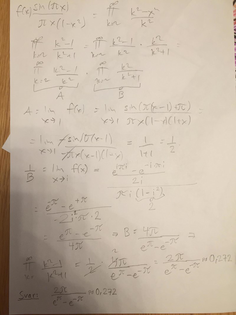 På den andra använde jag också mig av produkter som härstammar ur Weierstraß faktorsats, även om jag också utnyttjade produkten för (som ju är lika med ). Din och min framställning är ju i grunden samma, men skiljer sig så till vida att din framställning enbart kräver sinusprodukten, medan min kräver både sinusprodukten och hyperbolisk-sinus-produkten. Å andra sidan kan man undvika komplexa tal helt och hållet med och , vilket kan vara fördelaktigt eftersom dessa produkter kan bevisas relativt enkelt för reella (se t.ex. här) medan beviset för komplexa är mer invecklat.