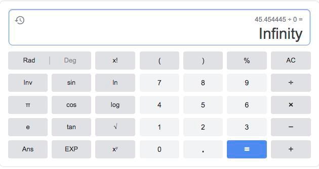 Det är egentligen inte oändligheten, utan ett odefinierat värde (oändligheten är inget eget värde), men oavsett, detta gäller för alla tal! , du kan prova med vilka tal du vill. Om man ska försöka förklara det lite enkelt kan man titta på vad ett bråk betyder; betyder "fem delat i två delar, dvs. 2,5". Om vi kikar på vad som händer om nämnaren blir mindre, , , , , och så vidare. När nämnaren blir nära noll kommer vårt värde på bråket att bli större och större.