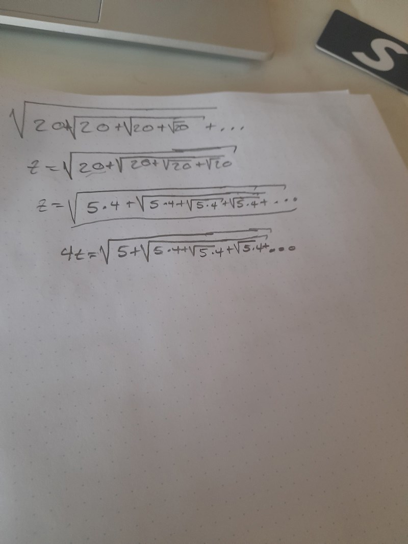 Som Naytte påpekar behöver nog konvergensen visas. ”Tures ekvation” ger en rekursionsformel: an+12=20+a Om vi sätter a0=0 får vi en följd som ser ut som den givna. Den är klart positiv. Med induktion bör man utan alltför stor ansträngning kunna visa att den är begränsad. Om man också kan visa att den är monoton så är saken klar.