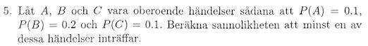 P(A eller B eller C) = 1 - P(Ej A och Ej B och Ej C)