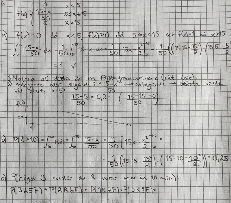 Om jag gissar rätt på vad din notation betyder, så tänker du beräkna sannolikheten att 3 raster är för långa (d v s längre än 10 min) + sannolikheten för 2 för länga raster + sannolikheten för 1 för lång rast + sannolikheten för 0 för lång rast. Det verkar som en framkomlig väg - så skulle jag ha gjort också. Däremot har vi naturligtvis ingen chans att se om du har räknat rätt eller inte, efterosm du inte redovisar hur du har tänkt på c-uppgiften.