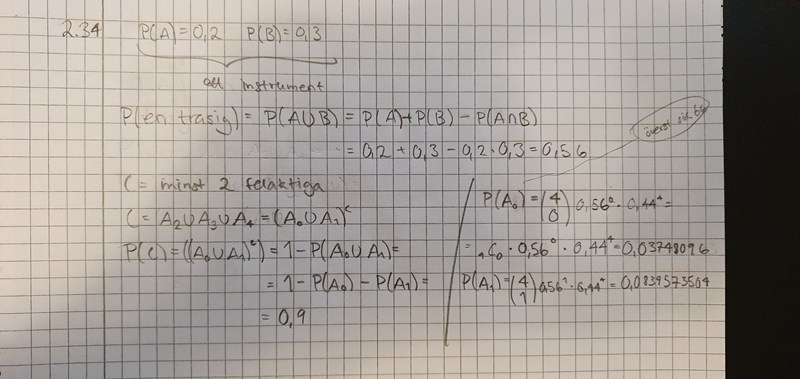 "Ett instrument består av två komponenter A och B och fungerar bara om båda komponenterna är hela. Vid en kurslaboration tar assistenten fram 4 sådana instrument. Han vet av bitter erfarenhet att en A-komponent brukar vara sönder med sannolikheten 0,2 och en B-komponent med sannolikheten 0,3. Beräkna sannolikheten att minst 2 av de 4 instrumenten ej fungerar. De åtta komponenterna antas gå sönder oberoende av varandra."