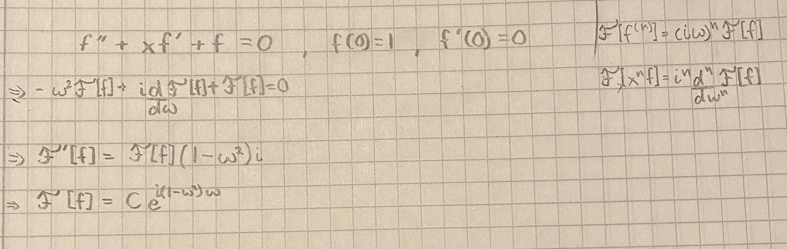 Tack så jättemycket! Jag vet inte riktigt hur jag fick det så pass fel först, men insåg sen precis som du sa att det blev en mycket enklare diff-ekvation. Jag får att F=ce^(-w^2/2). Finns det något enklare sätt att beräkna inversen för att få fram f, eller måste jag beräkna den här integralen?