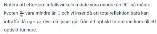 På något sätt då tänkte jag att totalreflektion är vinkeln på 90 grader, fast i själva verket är det reflektions vinkeln då brytnings vinkeln är 90grader, var trött igår.