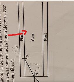 Hej, jag förstår vad ni båda menar. Jag är här för att klargöra detta. Alexander menar att han uppfattar a-uppgiften som att de frågar efter infallsvinkeln vid punkten A från luft till glaset. Medan Yngve tror att Alexander inte förstår hur man räknar ut infallsvinkeln vid B från glas till plast. (Vilket är det korrekta) Men Alexander söker hjälp med att beräkna ut infallvinkeln vid A från luft, alltså ai. Alexander provar att räkna ut ai genom denna uträkning: 1brytningsindex vid luft · sin(ainfallsvinkeln) = 1.5brytningsindex vid glas· sin(90)maximal brytningsvinkel