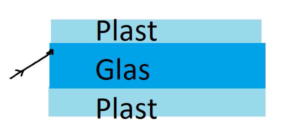 Så förstådde jag uppgiften, och att strålen som träffar plasten redan är bryten, och jag ska beräkna gränsvinkeln när den först går from luft till glas. Eller är den ihålig?