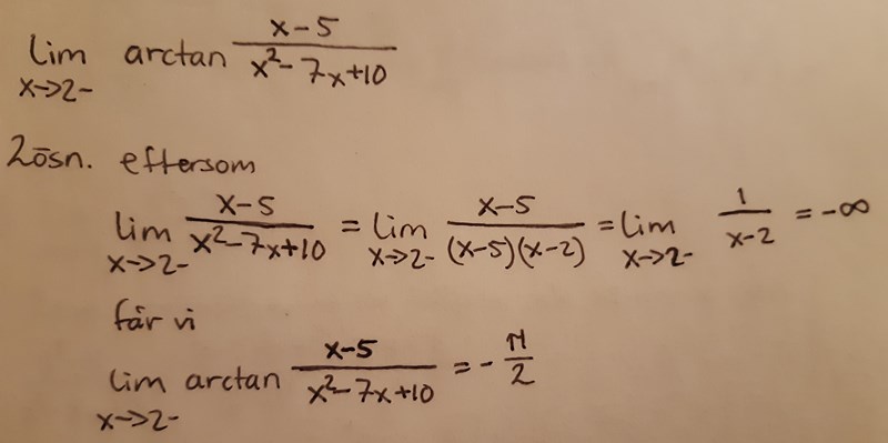 Du studerar vinkeln v=arctan1x-2v=\arctan \frac{1}{x-2} där talet x<2,x < 2, vilket betyder att vinkelns tangensvärde är