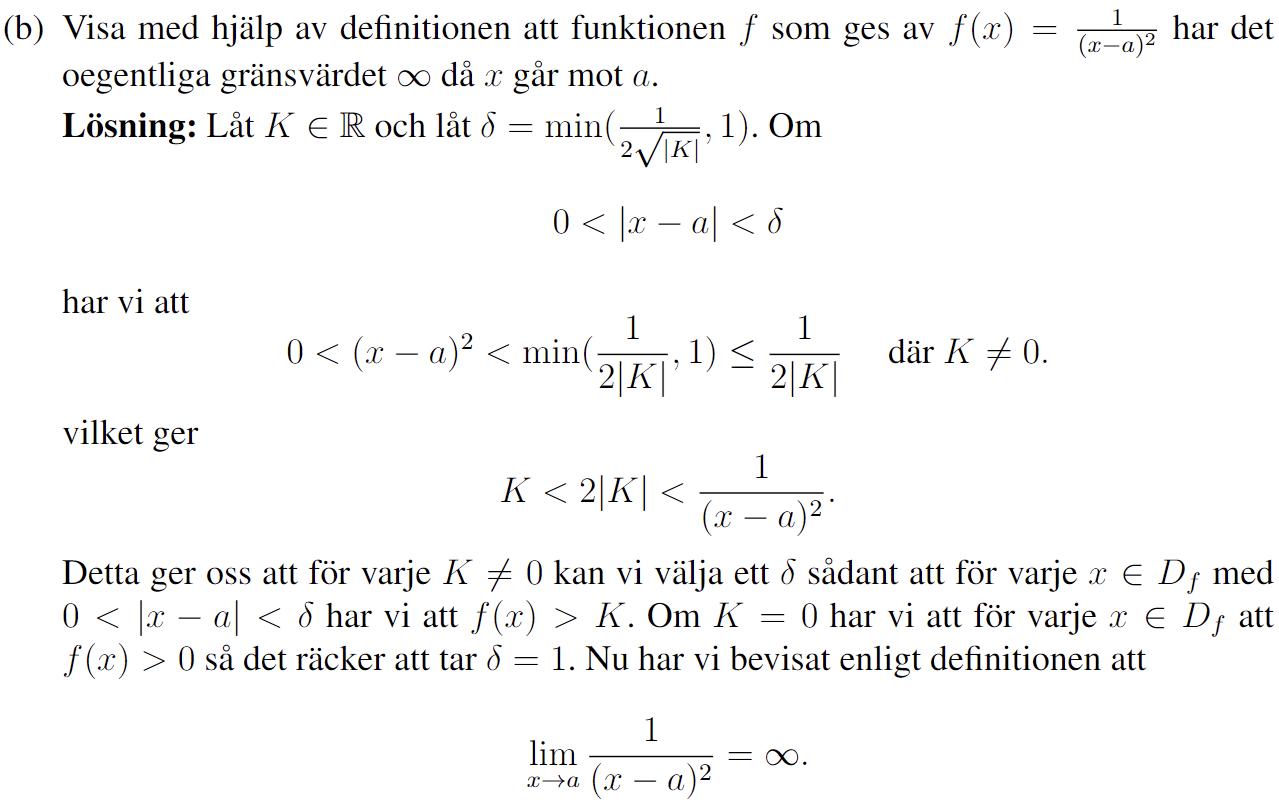 Jag förstår fortfarande inte hur man har bevisat någonting, det känns som att man likaväl hade kunnat skriva K<1x-a2 direkt. De skriver att delta = min(något slumpat a,b om jag har förstått dig rätt?) och sedan kvadrerar (borde bli 14K?) och inverterar de absolutbeloppet vilket ger en olikhet mellan K och ursprungsfunktionen. Är det då en generell metod att försöka skriva om deltaomgivningen till en olikhet mellan funktionen och gränsvärdet/oegentliga gränsvärdet?