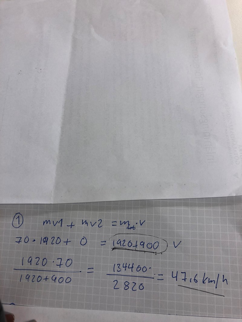 jimmy kör en bil som väger 1920 kg och kolliderar med en älgsom väger 900 kg bilens fart prices före kollisionen var 70 km/h.beräkna bilens hastighet efter kollisionen om kollisionen abtas vara fullständigt oelastisk.