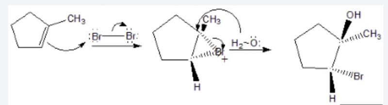 I mekanismen visas en anti-addition, där vatten anfaller bakifrån (s.k. backside attack). Om du tänker dig att C-Br-C tillsammans bildar en triangel, så kommer orbitalerna från de båda C-Br samt bindningen mellan kol 1 och 2, sticka ut från triangeln, motsvarande uppåt och åt vänster i bilden. Det blir ett bättre orbitalöverlapp bakifrån till den orbital från syret som skall skapa sigmabindningen till kol 1.