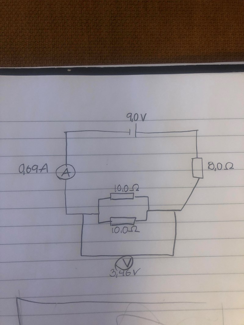 Du har också skrivit värdet på strömstyrkan i bilden. Om du redan känner till det värdet (0,69A) och batterispänningen (9V) så kan du räkna ut totala resistansen Rtot med hjälp av Ohms lag.