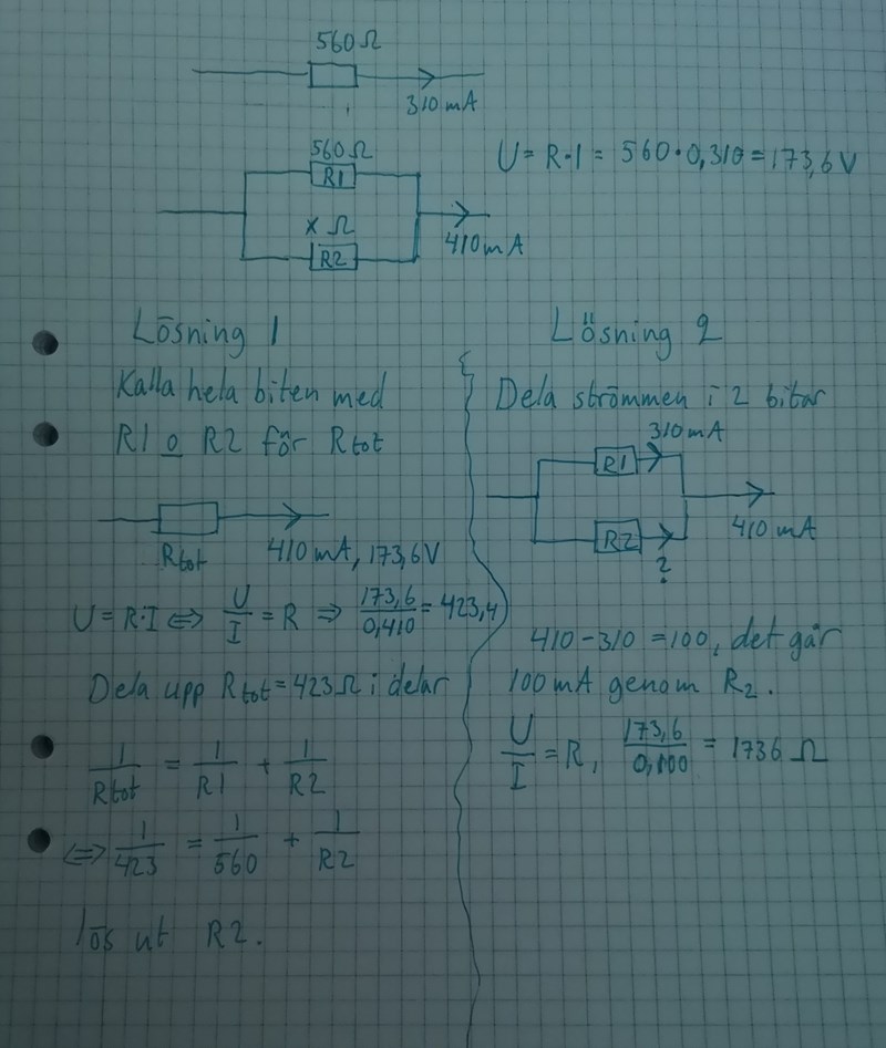 Genom en resistor på 560 ohm går en ström på 310 mA. När en okänd resistor parallellkopplas med 560 ohm resistorn stiger strömmen till 410 mA. Hur stor var den okända resistorn?