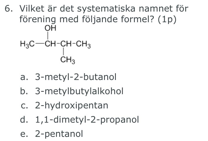 Varför skulle den heta enligt alternativ a som facit säger? 3-metyl-2-butanol berättar bara att det finns en metylmolekyl anslutet till det tedje kolvätet och att det finns en hydroxigrupp bundet till det andra kolvätet. Det säger inte hur många kolväten det finns totalt ju. Det hade kunnat finnas 20 st. Eller har jag missat något?