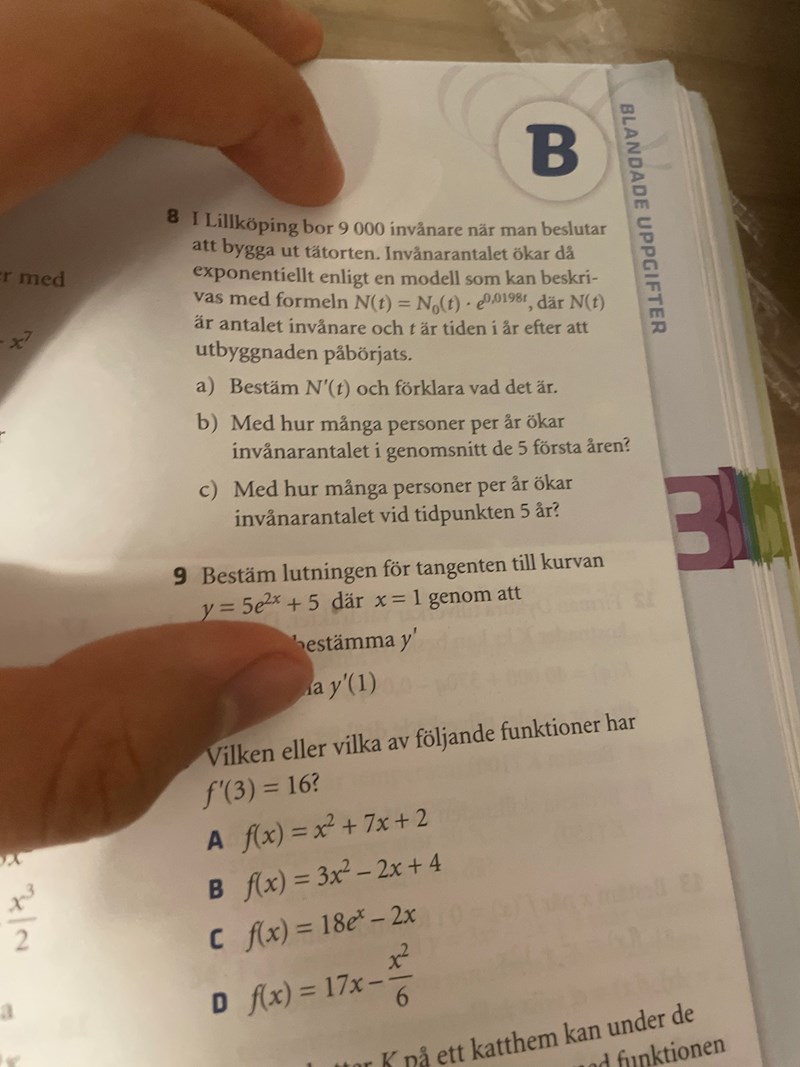 Tja jag behöver hjälp med 8 b) och C) om jag har förstått frågan rätt på b frågar de inte efter N’(5) de frågar efter n(5). När jag räknar ut n(5) och sedan subtraherat det med 9000 och delar med 5 får jag ökningen per år som fel svar.