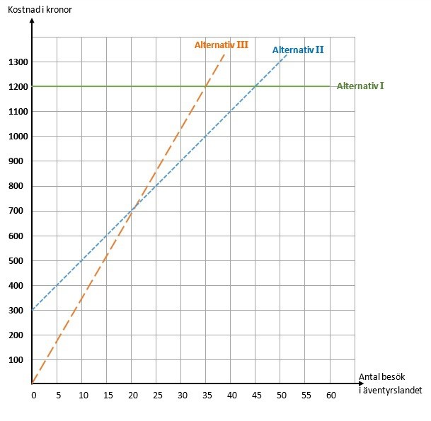 Du kan välja mellan tre olika betalningsalternativ I, II och III när du besöker äventyrslandet under ett år. Diagrammet visar de tre betalningsalternativen.