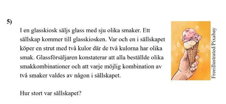 Då blir antalet olika glassar lika med antalet sätt att välja ut 2 smaker ur en grupp med 7, dvs C(7,2). Här pratar vi om kombinationer.
