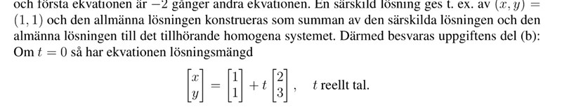 pepparkvarn skrev:Att du hittat rötterna t = 0 och t = -1 betyder att systemet antingen saknar lösningar eller har oändligt antal lösningar då t = 0 eller 1. Du kan hitta vilket det är genom att sätta in värdena och lösa systemet. :)