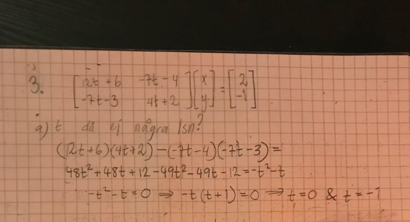 Löste med determinantmetod och fick t=0 och -1, betyder det att det saknar lösningar då t är 0 eller -1? Och försökte först lösa frågan med gauss men kom ingen vart. Hur löser man a) med gauss?