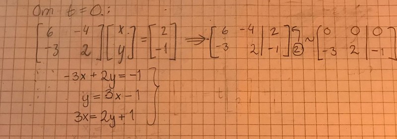 Ok försökte stoppa in t=0 i allafall och ser att den har oändliga lösningar då, men får inte fram parametriseringen!!