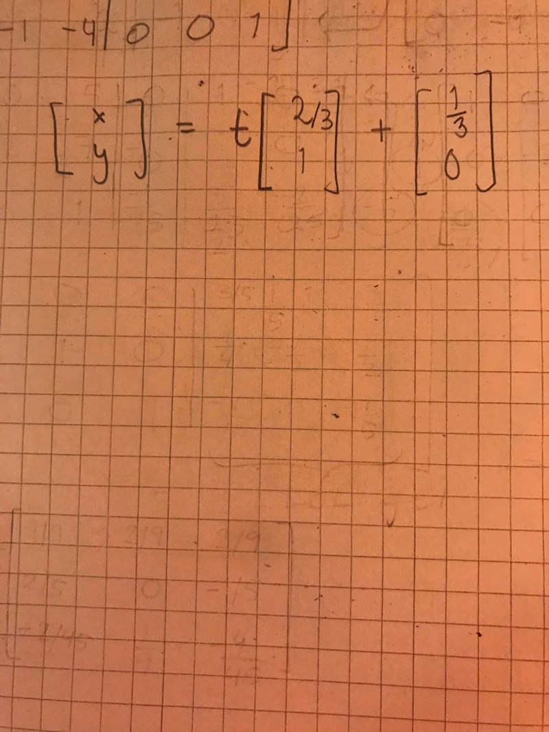 Du har ekvationen -3x + 2y = -1, mycket riktigt. Om du sätter y till t, får du att och y = t. Hur kan du skriva det som en punkt plus en vektor? :)