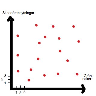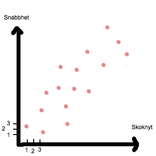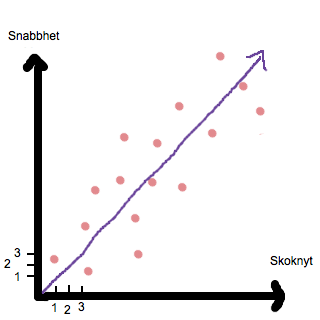 I denna graf kan vi inte dra en rät linje som förutspår hur många gånger en person som äter 20 portioner grönsaker per vecka kommer att knyta skorna. Det finns då inget linjärt samband. Det finns inget samband alls. Vi tänker då "Men om vi undersöker skosnöreknytningar och antal hur snabbt personerna kan klä på sig ytterkläder? Vi får då detta resultat: