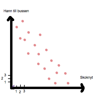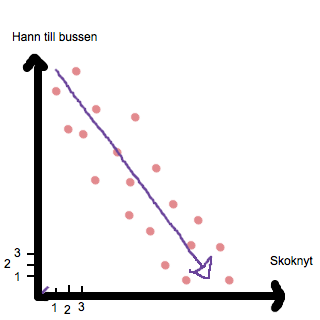 Här innebär en ökning i skoknyt till en minskning i antalet bussar personerna hann med, och vice versa. Detta kallas för omvänt proportionerligt samband. De frågor vi mäter hänger helt klart ihop, men åt omvänt håll. En ökning av den ena parametern innebär en minskning av den andra.