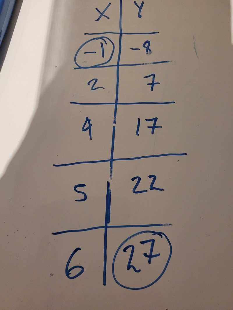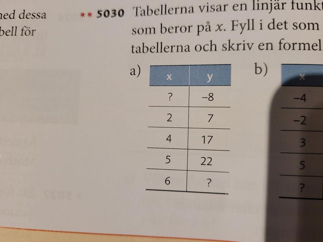 Tabellerna visar en linjär funktion y som beror på x. Fyll i det som fattas i tabellerna och skriv en formel.