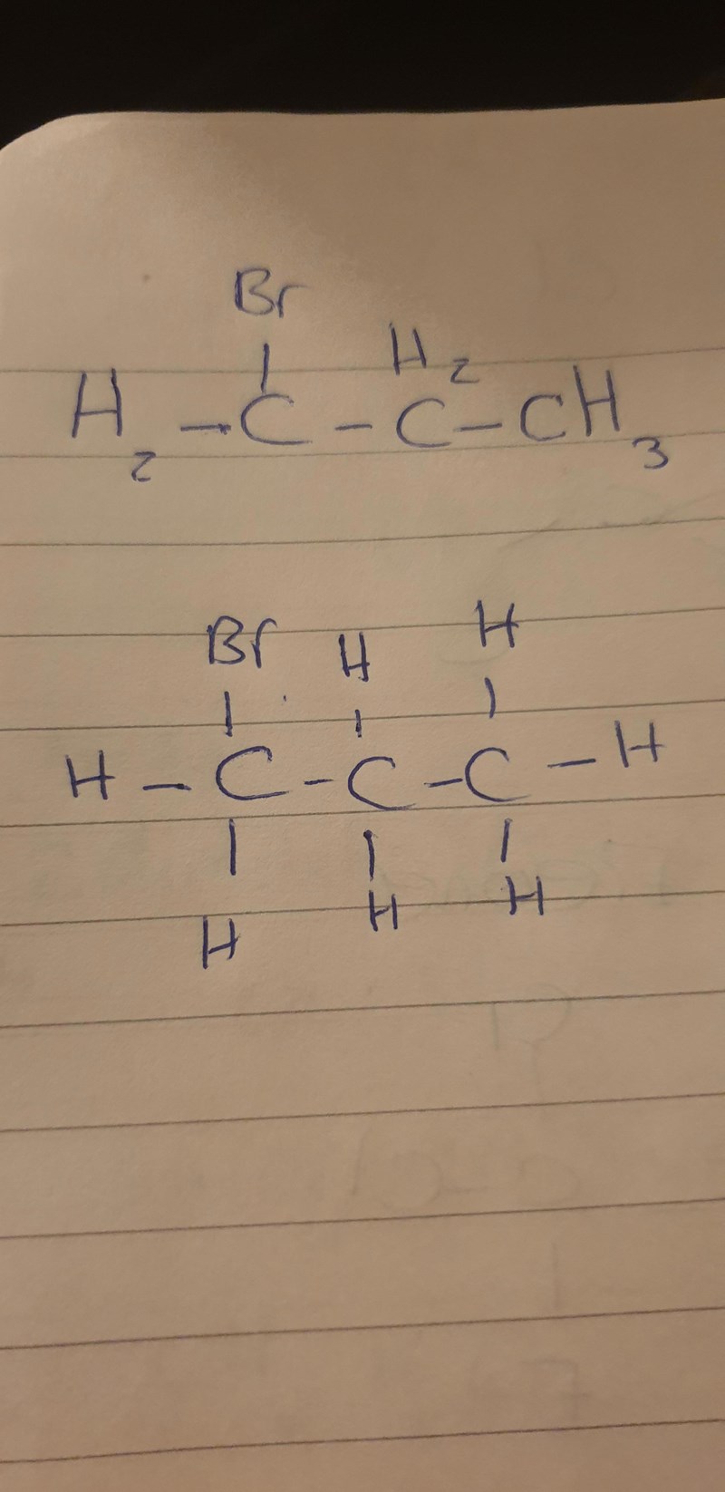 Nej, den första är fel. Kolet skall ha fyra bindningar, inte tre, och kolatomen binder inte till någon "H2".