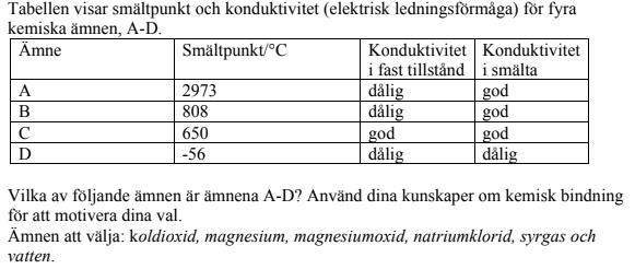 Man kan dela in ämnena i jonföreningar, kovalenta föreningar (d v s molekyler) och metaller. Vilken sorts ämnen är det som kan leda elektricitet i fast form?