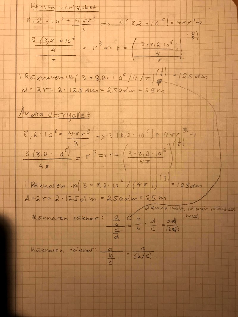 Den här uppgiften kan lösas genom att man löser ut r i och efter att ha löst ut r blir formeln: . Detta stämmer med facit då diametern är 25 meter enligt facit. Och 2r = 2 * 125 dm = 250 dm = 25 m.