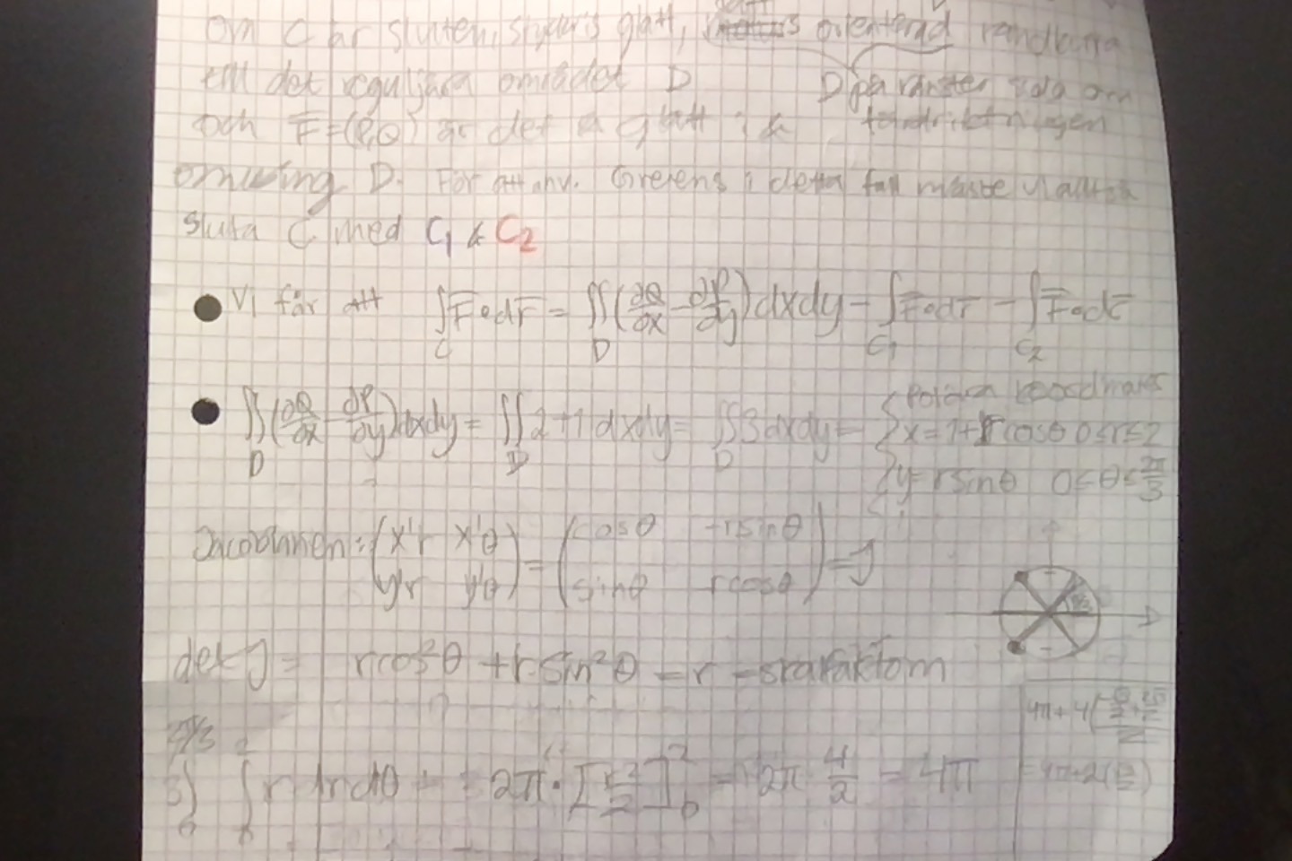Ok, men din integral går över en cirkelsektor. De två linjesegmenten går längs x och y-axlarna. Du missar att integrera över en triangel nere i vänstra hörnet.