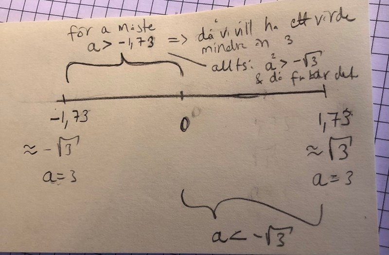 Menar du att från 0 ut mot roten ur neg. 3 så måste vi få det större för att om tex får ett värde som är -4 så blir a^2<roten ur 3. Det blir då -4^2 och alltså 16. Så jag måste gå mot positivt dvs närmare noll. Men inte mot andra sidan för att där har jag redan insett att a ska vara mindre än roten ur 3. Resonerar jag rätt?