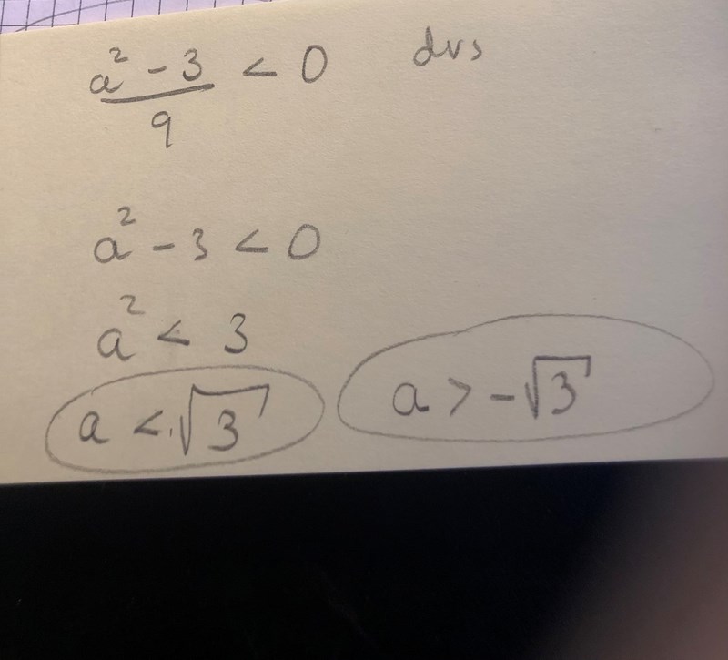 På uppgift 3127 a) får de två svar när a är mindre än roten ur 3 och när a är större än minus roten ur 3.