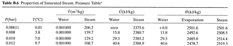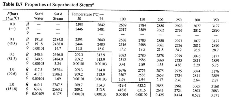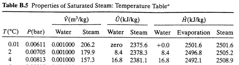 - Tabell 5 och 6 är alltså exakt samma, de ger värden (V, U, H) för saturated steam vilket är (ren) ånga exakt vid temperaturen där den förångas (som beror på trycket och är inte alltid 100c, alltså kokpunkt)?