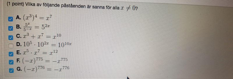 Påstående C är "För alla x0x\neq0 gäller att x3+x7=x10x^3+x^7=x^{10}."