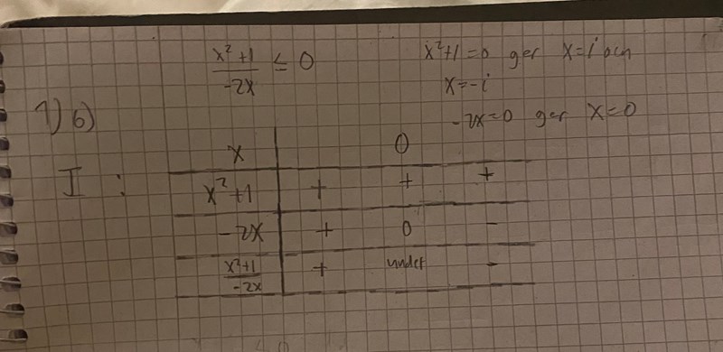 Hej! Jag ska lösa olikheten x^2+1/-2x ska vara mindre eller lika med 0. Enligt min beräkning så kan x^2+1/-2x inte vara lika med 0 då om täljaren är lika med 0 så ger detta två imaginära tal ( X ska tillhöra reella talen enligt min uppgift). Täljaren kan även inte vara negativ. Nämnaren är 0 då x =0 dvs vi har en intressant punkt vid x =0 men som ni ser på min tabell så kommer x^2+1/-2x att vara negativ då X är större än 0 MEN jag vill ju veta när x^2+1/-2x är mindre ELLER LIKA MED 0. Blir svaret då att x>0 eller är svaret att det inte finns några lösningar som uppfyller x^2+1/-2x ska vara mindre än eller lika med 0? Tack på förhand!!!!!