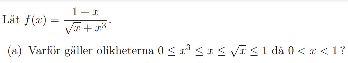 Hur går detta ihop? Jag har någon tanke om att bryta ut dominerande term, men det blev inte bra då. Alltså jag ser ju att olikheten stämmer för x mellan 0 och 1, men vet inte hur jag ska visa det