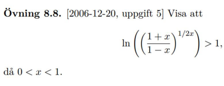 [(1+x)1/(2x) / (1–x)1/(2x) ] ska visas vara > e när 0 < x < 1
