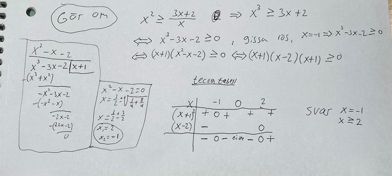 Korra skrev:Hej, varför får jag inte alla lösningar med följande metod? Ser i ursprungsolikheten att x<0 också är en lösning men inte i teckentabellen